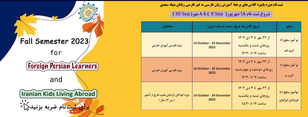 بنیاد سعدی دوره آموزش زبان فارسی فصل پاییز ۱۴۰۲ را در «سطح ۱» برای فارسی آموزان خارجی و فرزندان ایرانیان مقیم خارج از کشور به صورت برخط همزمان (مجازی) برگزار میکند و ثبت این دورهها از ۱۸ شهریور ماه ۱۴۰۲ آغاز و تا ۸ مهرماه ۱۴۰۲ ادامه دارد.
